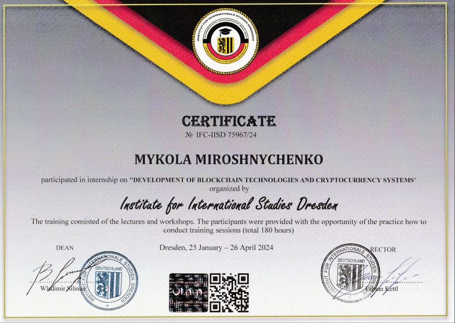 - Міжнародне стажування на тему «Development of blockchain technologies and cryptocurrency system», 25 January – 26 April 2024, 180 hours