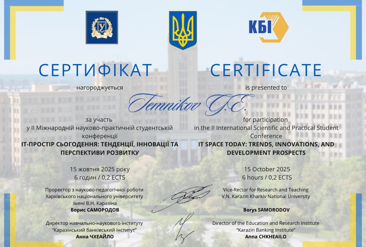 - Підвищення кваліфікації на тему «Дослідження соціально-економічних систем», 31.03.25-15.04.25, 60 годин, сертифікат № 00493698 / FEB0172-25