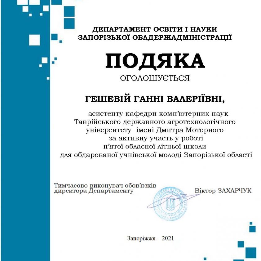 На початку червня 2021 року кафедра «Комп’ютерні науки» брала участь у п’ятій обласній літній школі для обдарованої учнівської молоді Запорізької області. Від кафедри з доповіддю «Можливості та перспективи ІТ-технологій» виступила асистент кафедри Гешева Г.В. Вона наголосила на важливих питаннях інформатизації нашого регіону, майбутнього працевлаштування тощо.
