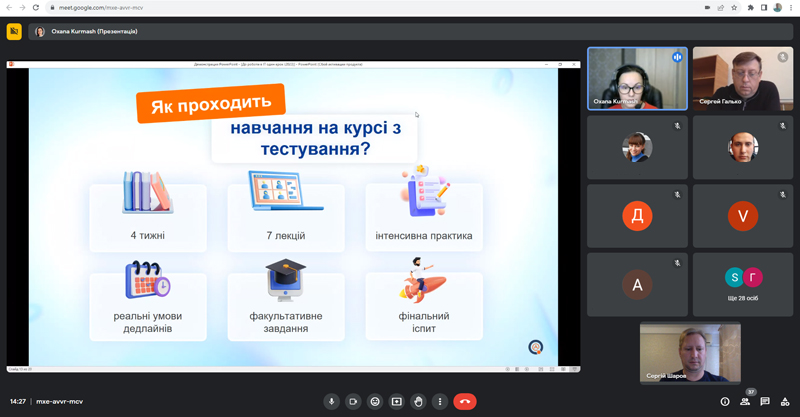 Під час онлайн-презентації співробітники компанії QATestLab розповіли про професію тестувальника програмного забезпечення, особливості та переваги даної професії. Спікерка Oxana Kurmash ознайомила учасників вебінару про можливість безкоштовно пройти онлайн курс для опанування професією QA Engineer, повідомила про його структуру та умови отримання сертифікату.