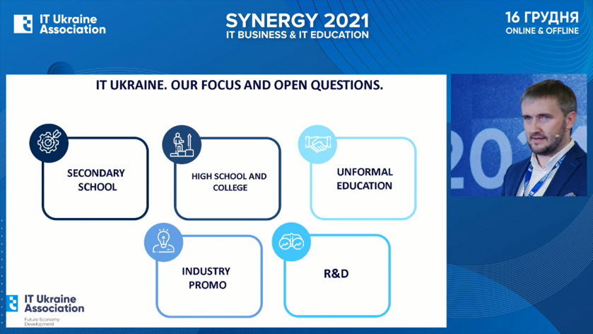 Упродовж 16-17 грудня 2021 відбулася спеціалізована конференція “Synergy. IT Business & IT Education 2021”, яка стимулює розвиток ІТ освіти. Вона проводилася в змішаному форматі – online, на каналі YouTube та Facebook; offline, в Києві в Inveria event space. Від кафедри «Комп’ютерні науки» до цієї конференції долучилася асистент кафедри Ганна ГЕШЕВА.