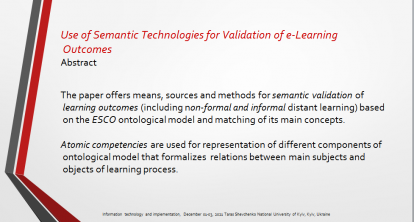 Від Таврійського державного агротехнологічного університету імені Дмитра Моторного на конференцію в секції «E-commerce, E-government and E-learning Technologies» було представлено результати досліджень, здійснених в рамках проєкту «Теоретичне обґрунтування та розроблення інформаційної системи семантичної ідентифікації, документування та обробки результатів неформального та інформального навчання», на тему «Use of Semantic Technologies for Validation of e-Learning Outcomes» (автори Юлія Рогушина, Сергій Прийма, Оксана Строкань, Анатолій Гладун). Колектив авторів з доповіддю представила кандидат ф.м-.н., доцент, старший науковий співробітник відділу Автоматизованих інформаційних систем Інтситуту програмних систем Юлія РОГУШИНА.