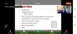 Слід зазначити, що актуальність публікацій Scopus та WOS спричинили значне зростання журналів, які маскуються під авторитетні видавництва та журнали та пропонують за відносно невелику плату опублікувати наукові дослідження. Такі хижацькі видання завдають шкоди дослідникам, закладам вищої освіти та видавництвам. Зважаючи на це, на вебінарі були розглянуті актуальні питання, що стосувалися наслідків публікації у хижацьких виданнях, за таким планом: