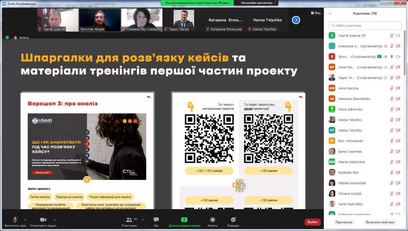 Спікерка Сніжана Леу-Севериненко зазначила, що даний захід є одним із напрямків діяльності Проєкту USAID «Економічна підтримка Східної України». Спікер Ярослав Жидик, який є учасником та переможцем всеукраїнських та міжнародних кейс-чемпіонаті, поділився власним досвідом про створення кейс-клубу у закладі вищої освіти, висвітлив різні кейси, в яких він брав участь.