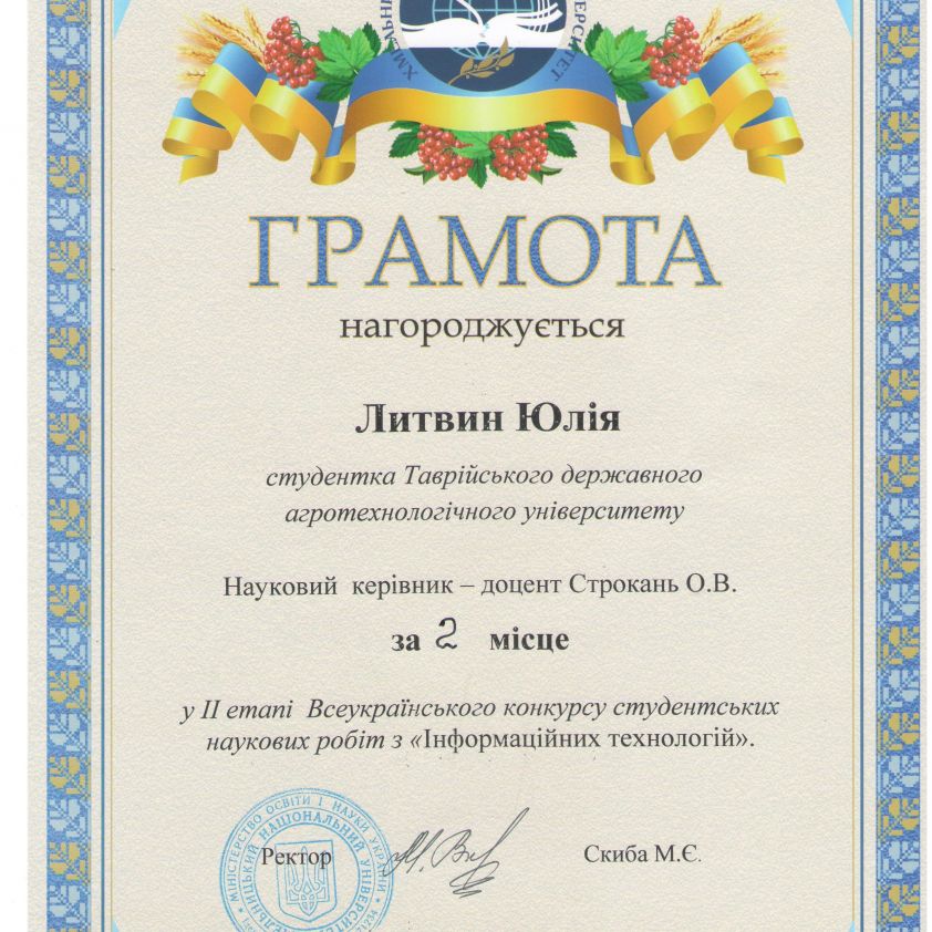 У конкурсі від Таврійського державного агротехнологічного університету прийняла участь Литвин Юлія Олександрівна з доповіддю на тему «Система моделювання аероіонного розподілу на комбінованій площині на базі ОС Android», керівник доцент Строкань Оксана Вікторівна.