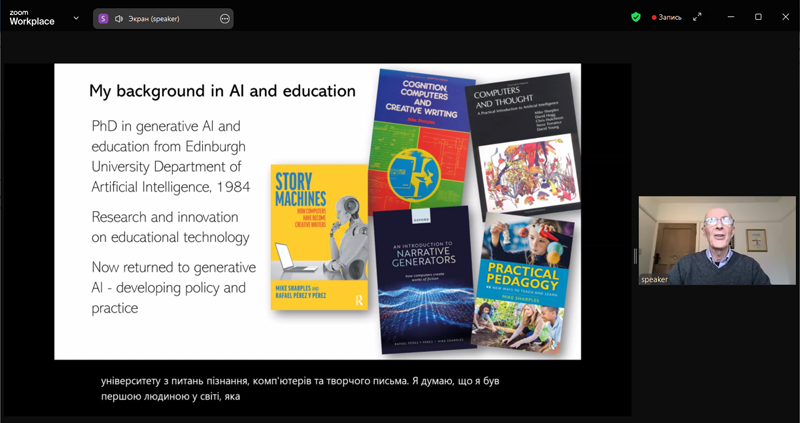 Спікером вебінару був професор Майк Шарплз (Mike Sharples), доктор філософії з штучного інтелекту, магістр обчислювальної техніки, почесний професор Інституту освіти Відкритого університету, Великобританія (Emeritus Professor at Institute of Education, The Open University, UK). Доповідь спікера супроводжувалася синхронним перекладом на українську мову, що дозволило долучитись до лекції широкій аудиторії слухачів.