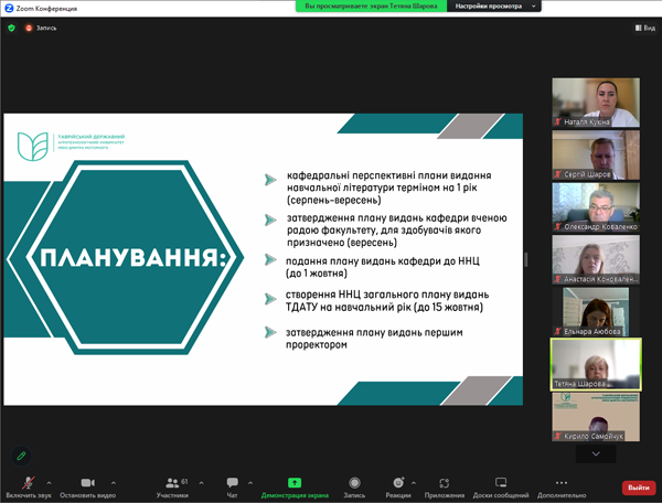 Під час робочого засідання начальник ННЦ Тетяна ШАРОВА наголосила на важливості вчасного забезпечення освітнього процесу актуальними фаховими виданнями. Спікерка наголосила на тому, що у професорсько-викладацького складу Університету великі спроможності, що дозволяє викладачам ТДАТУ створювати високоякісний навчально-науковий продукт. Тетяна ШАРОВА презентувала візуально-графічну доповідь, що дозволило чітко виокремити подальші кроки від планування навчальних видань до затвердження на вченій раді університету.