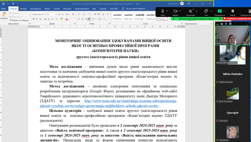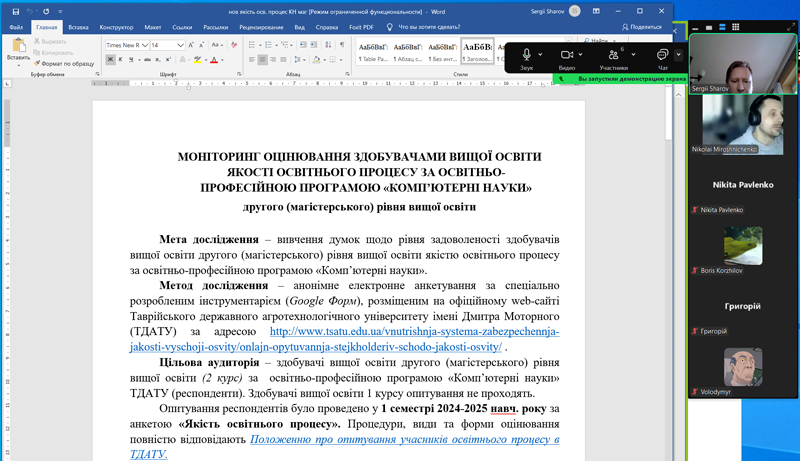 6 лютого 2025 року була проведена інформаційна зустріч зі здобувачами вищої освіти другого (магістерського) рівня вищої освіти (2 курс) за освітньо-професійною програмою «Комп’ютерні науки» ТДАТУ з метою їх інформування з результатами проведеного опитування щодо якості освітнього процесу та освітньої програми. На зустрічі були присутні гарант освітньої прогами «Комп’ютерні науки» Микола Мірошниченко та завідувач кафедри комп’ютерних наук Сергій Шаров.