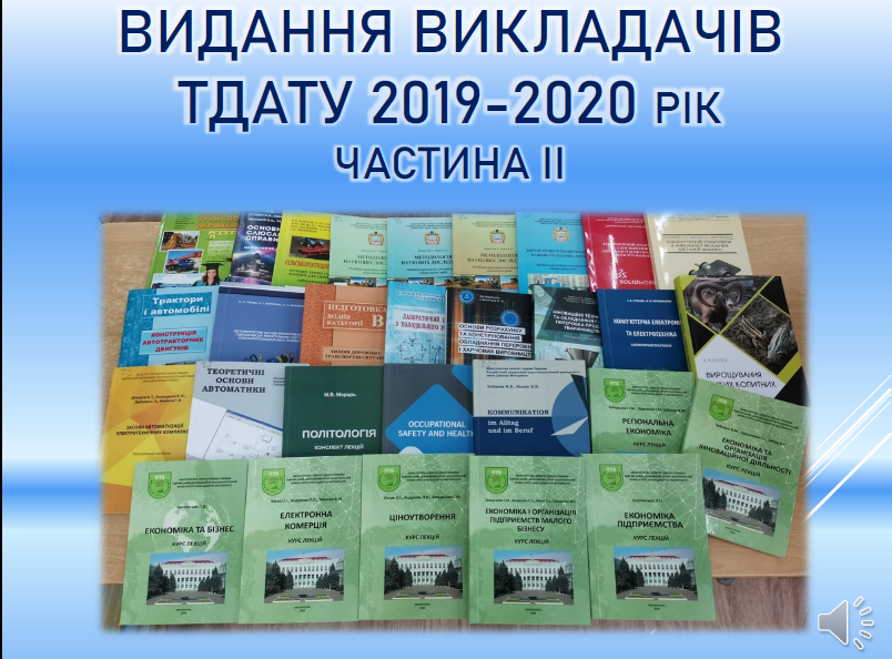 Наукова бібліотека підготувала другий випуск відео-презентації видань викладачів ТДАТУ за останні два роки. Більш детальніше з представленими виданнями ви можете ознайомитись, звернувшись до наукової бібліотеки.
