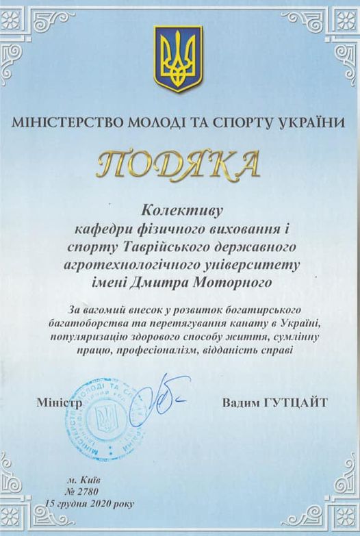 Колектив кафедри фізичного виховання і спорту Таврійського державного агротехнологічного університету імені Дмитра Моторного вперше за свою 90-річну історію отримав подяку від Міністерства молоді та спорту України за особистим підписом міністра Вадима Гутцайта.