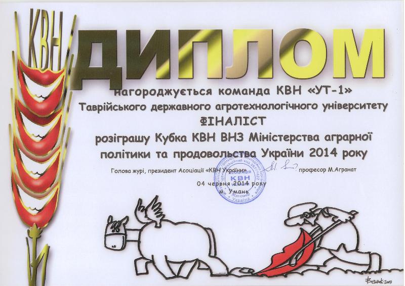 Команда КВН «УТ-1» ТДАТУ – одна з накращих! 16.09.2015 Команда КВН «УТ-1» ТДАТУ – фіналіст розіграшу Кубка КВН ВНЗ Міністерства аграрної політики та продовольства України 2014 року, який відбувся 3-4 червня 2014 року в м. Умані.