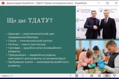 Участь у підсумковій онлайн-конференції взяли понад 400 осіб з різних реґіонів України. Команду ТДАТУ очолила Анастасія Коноваленко, директор інституту підвищення кваліфікації, д.е.н., професор кафедри економіки і бізнесу. Унікальність проєкту було досягнуто завдяки залученню академічних менеджерів університету, які опікуються різними напрямами діяльності, та зробили вагомий внесок у спільний результат. Розробниками проєкту інституційних змін стали учасники команди ТДАТУ на першому циклі навчання:
