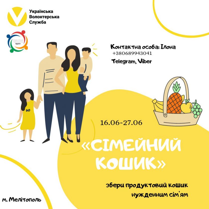Акція «Сімейний кошик» проходить з 16 по 27 червня в місті Мелітополь та Мелітопольському районі. Акція полягає в тому, щоб допомогти нужденним сім’ям продуктовими наборами.