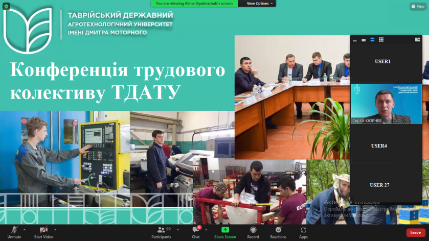 22 вересня у Таврійському державному агротехнологічному університеті імені Дмитра Моторного відбулась конференція трудового колективу. Вона проходила в змішаному форматі з допомогою платформи Zoom. Співробітники ТДАТУ зібралися на конференції, щоб привітати колег з ювілеєм Університету і вирішити важливі питання порядку денного конференції.