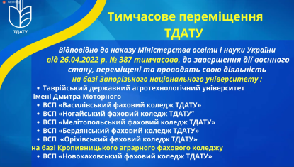 У зв’язку із тимчасовою окупацією міста Мелітополя та згідно з наказом Міністерства освіти і науки України від 26.04.2022 №387, Таврійський державний агротехнологічний університет імені Дмитра Моторного був тимчасово переміщений на базу Запорізького національного університету, де увесь цей час і до сьогодні активно працює ректорат, деканати факультетів та інші структурні підрозділи університету.