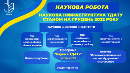 На 2022 рік ТДАТУ отримав найбільше фінансування з держбюджету за останні роки. На жаль, у зв’язку з воєнним станом та тимчасовою окупацією, робота ННЦ була призупинена, як і призупинилися контакти з підприємствами та фермерськими господарствами південного регіону, що призвело до різкого зменшення надходжень від госпдоговірної тематики, які вдалося заробити до окупації.
