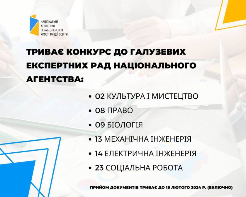 Нагадуємо, що триває конкурс на вакантні місця до галузевих експертних рад Національного агентства із забезпечення якості вищої освіти.