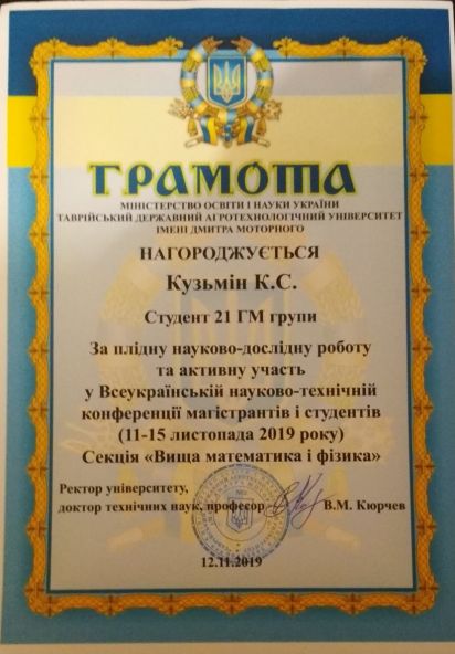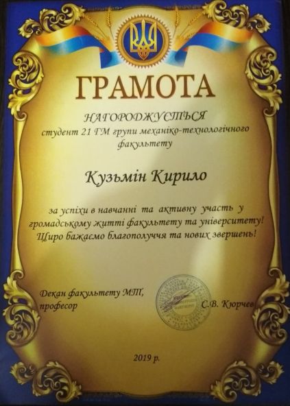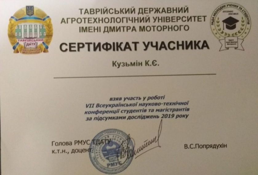 Кирило Кузьмін «З вересня 2018 року я розпочав своє студентське життя у Таврійському державному агротехнічному університеті імені Дмитра Моторного, на механіко-технологічному факультеті за спеціальністю галузеве машинобудування. Навчаюсь на 3 курсі, є старостою академічної групи. Також я є членом студентської ради механіко-технологічного факультету, тимчасово виконую обов’язки заступника голови студентського самоврядування, голови наукового сектору. Беру участь у науково-дослідницькій роботі, маю власні патенти та наукові публікації. Удосконалюю англійську мову. Я підтримує імідж університету, беру участь у міських та обласних спортивних змаганнях. У вільний час граю у футбол».
