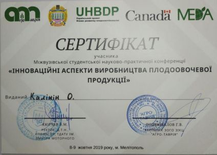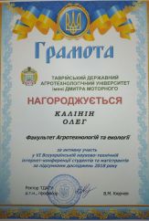 Олег Калінін – у 2016 році став студентом Таврійського державного агротехнологічного університету імені Дмитра Моторного. Про роки студентства хлопець розповів сам: «За 4 роки навчання я пройшов величезний курс як теоретичної, так і практичної підготовки. Цю підготовку забезпечують студентам професійна, завзята команда викладачів, спроможних відповісти на будь-яке ваше запитання із задоволенням й оригінальністю. Впродовж навчання мені відкривалось безліч можливостей подорожувати Україною та за її кордонами. Так, у лютому 2019 року мені вдалося побувати у столиці Франції, у місті закоханих – Парижі. Це стало можливим завдяки перемоги у благодійному проєкті «Агро-2019». Тоді я відвідав найбільшу міжнародну агровиставку SIMA 2019, в якій брали участь 1770 компаній з 42-х країн світу. У березні того ж року я отримав можливість представляти свою наукову роботу у Вінниці, на 2-му етапі Всеукраїнського конкурсу студентських наукових робіт зі спеціальності «Агрономія». У вересні 2019 – був учасником професійного триденного тренінгового курсу “Вирощування суниці в закритому ґрунті”, який проходив у Києві. Представленні подорожі допомогли мені розширити мій кругозір, здобути нові знайомства та зв’язки, за що я вдячний факультету АТЕ та університету».