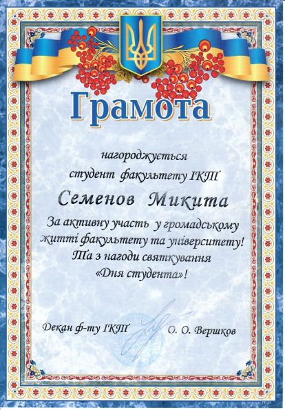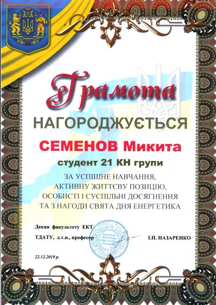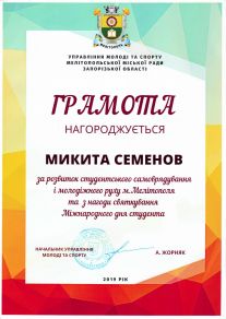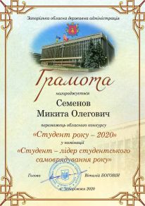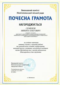 Микита Семенов навчається у ТДАТУ з 2018 року за напрямом підготовки «Комп’ютерні науки». За час навчання зарекомендував себе як організаційна, дисциплінована, старанна та цілеспрямована людина. Микита навчається на «відмінно», відповідально ставиться до виконання громадських доручень студентського самоврядування факультету та університету. У 2020 році Микита – стипендіат Запорізької обласної державної адміністрації. З 2019 року – голова комітету з питань культури, спорту та туризму Молодіжного парламенту Мелітополя. З 2018 року входить до складу студентської ради факультету. У 2019 році обраний головою Організаційного сектору студентського самоврядування ТДАТУ та заступником голови студентської ради університету. За відмінні успіхи у навчанні та активну участь у суспільному житті університету і факультету неодноразово нагороджений подяками та грамотами. Микита обраний студентським омбудсменом, до обов’язків якого входить представлення та захист прав, основних свобод та інтересів студентів ТДАТУ. Микита постійно бере участь в організації міських заходів, таких як: «Різдво Разом», «Брейн-Ринг до 235-ої річниці міста Мелітополя», «Черешньово». Є волонтером у Всеукраїнській акції «Том Сойер FEST», у різноманітних толоках тощо. Був учасником Зльоту відмінників ТДАТУ.
