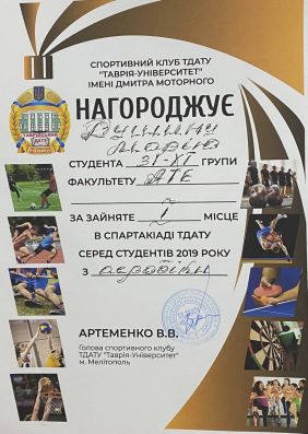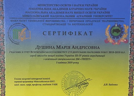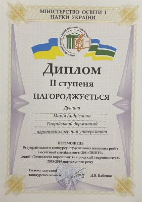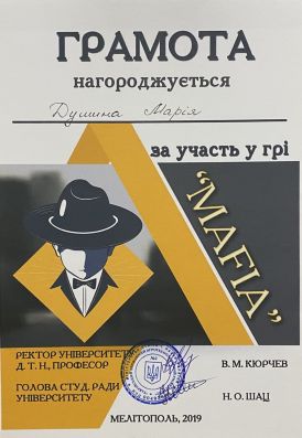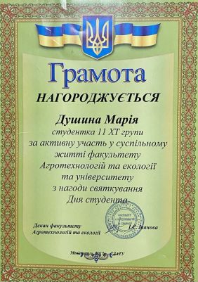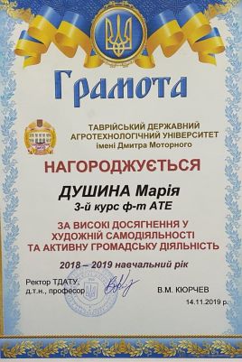 Марія Душина – навчається у Таврійському державному агротехнологічному університеті імені Дмитра Моторного на 4 курсі за напрямом підготовки «Харчові технології». За час навчання зарекомендувала себе як дисциплінована, відповідальна, працьовита, дисциплінована та організаційна людина, вимоглива до себе та інших. У навчанні відрізняється цілеспрямованістю, здатністю до сумлінної праці. Має лише добрі та відмінні показники у навчанні, логічне мислення та творчу уяву. Навчалась 9 років у клубі спортивно-бального танцю «Грація». До навчання в університеті ставиться з великою відповідальністю. З першого курсу Марія є заступником старости групи, активним членом студентського самоврядування факультету та університету. Постійно бере активну участь у справах групи, у громадському житті факультету, університету та міста Мелітополь. Марія завжди відповідально ставиться до творчої роботи та якісно виконує її. Активна, обдарована, ініціативна, вихована. Допомагає в організації студентського дозвілля. Користується повагою серед студентів, викладачів. Має багато друзів, підтримує дружні стосунки з багатьма студентами університету та учасниками творчих колективів ЦКІД.
