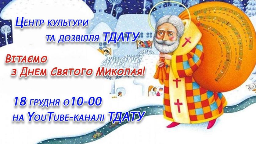 Центр культури та дозвілля і ТелеРадіоПресЦентр ТДАТУ 18 грудня о 10-00 запрошують всіх бажаючих долучитися до перегляду музичного вітання з Днем Святого Миколая.