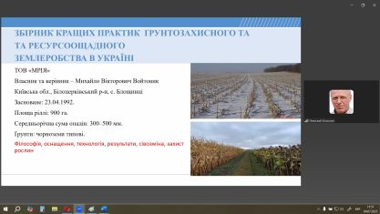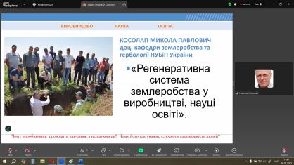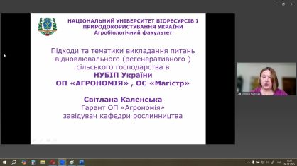 Перед учасниками круглого столу виступили представники агропідприємств та поділилися досвідом впровадження елементів відновлювального сільського господарства в практику (Кисельов Д. «Західний Буг», Корнієнко Т. «A-Grain», Vogel F. «Розета-агро»). Також, представники академічної спільноти поділилися досвідом інтеграції деяких аспектів регенеративного сільського господарства до освітнього процесу на магістерських освітніх програмах (д.с.-г.н., проф. Каленська С., к.с.-г.н., доц. Кололап М., д.с.-г.н., проф. Козарь С.).