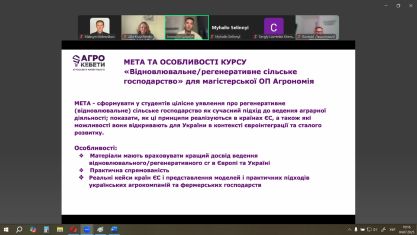 Днями відбувся перший круглий стіл за темою «Розробка навчального модуля «Технології відновлювального сільського господарства» для магістерської ОП «Агрономія». Зустріч відбувалася в рамках проєкту Агрокебети за підтримки Агенства з підтримки підприємництва Нідерландів та Посольства Нідерландів в Україні «Зелена освіта для сталого сільського господарства».