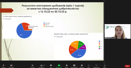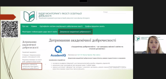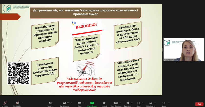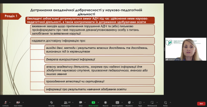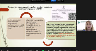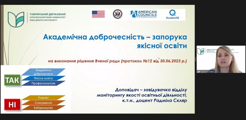 Пані Радміла більш детально зупинилася на доведенні основних вимог Положення про академічну доброчесність учасників освітнього процесу в ТДАТУ, яке визначає засади забезпечення академічної доброчесності в освітній діяльності ТДАТУ, підстави та порядок притягнення науково-педагогічних працівників та здобувачів вищої освіти до академічної відповідальності за порушення вимог академічної доброчесності.