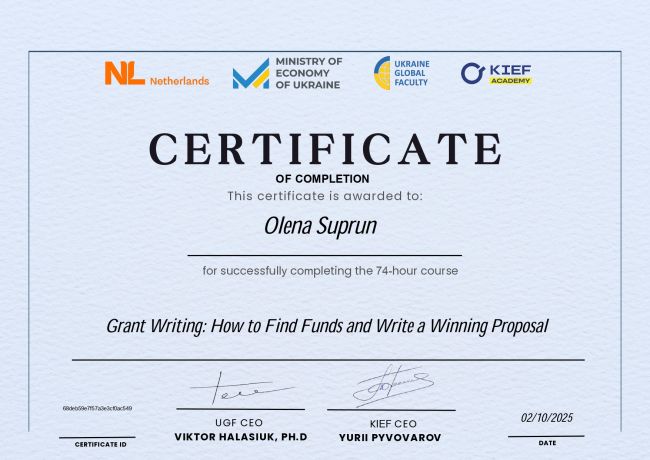 Таким чином, проходження курсу з грантрайтингу є не лише особистим досягненням викладачки, а й внеском у розвиток інституційної культури проєктного мислення, що є ключовим для трансформації української вищої освіти в умовах глобальної конкуренції та постійних змін. Цей курс став важливим етапом її професійного розвитку, відкривши нові горизонти для участі в міжнародних освітніх проєктах і залучення фінансування до університетських ініціатив.
