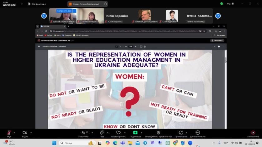 8 жовтня 2024 року на онлайн-платформі ZOOM, на базі кафедри маркетингу, для науково-педагогічних працівників та аспірантів Таврійського державного агротехнологічного університету імені Дмитра Моторного» відбувся цікавий захід на тему «Гендерно зумовлене лідерство у вищій освіті: вітчизняні та зарубіжні практики нормативного закріплення та практичної реалізації».