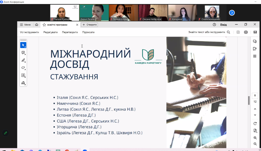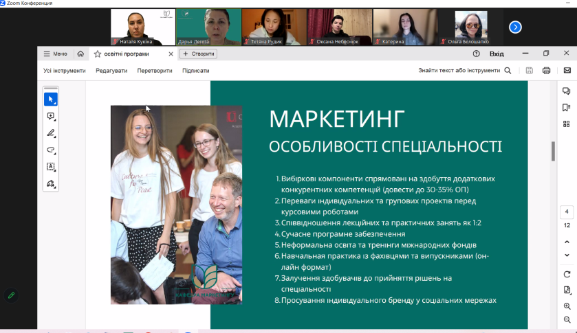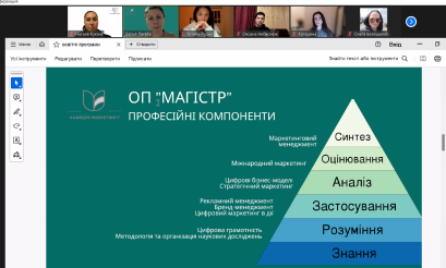 Дар’я Легеза, як гарант освітньої програми «Маркетинг» другого (магістерського) ступеня освіти ознайомила здобувачів освіти з Освітньою програмою. Було детально сконцентровано увагу на комплекс освітніх компонентів (предметів вивчення, дисциплін, індивідуальних завдань, контрольних заходів тощо), спланованих і організованих для досягнення визначених результатів навчання. Також зроблено акцент на можливостях міжнародної практики, стажування, а також спілкування з провідними фахівцями світу в галузі маркетингу.