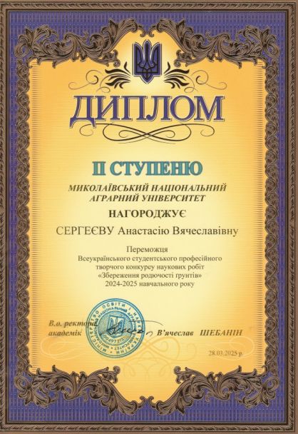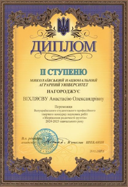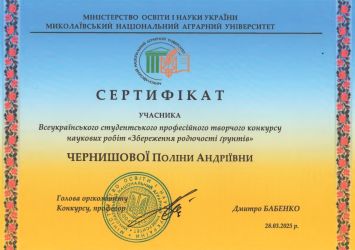 25 березня 2025 на базі агротехнологічного факультету Миколаївського національного аграрного університету відбулася підсумкова науково-практична онлайн-конференція конкурсу наукових робіт «Збереження родючості ґрунтів» де здобувачі презентували на захищали результати своїх наукових робіт.