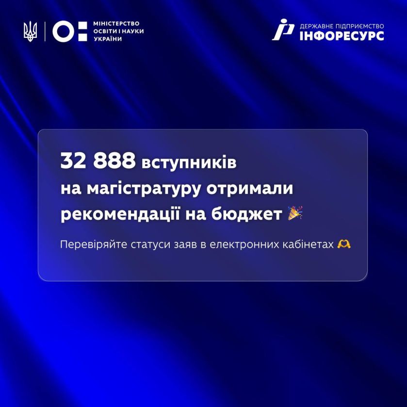 Рекомендації до зарахування на бюджет уже у ваших електронних кабінетах та на сайті: https://vstup.edbo.gov.ua 32 888 вступників за підсумками автоматичного розподілу місць пройшли на бюджет.