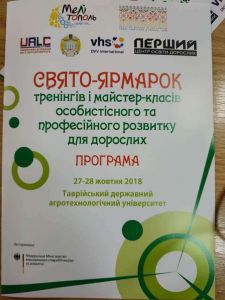 У 2017-2018 роках фахівці ТДАТУ активно брали участь у традиційних святах-ярмарках тренінгів і майстер-класах з особистісного та професійного розвитку для дорослих. Тематика заходів були найрізноманітніші – від професійних тренінгів з маркетингу та просування особистого бренду – до курсів масажу та самомасажу. Не обійшлося без майстер-класу «Розпис печива» під керівництвом к.т.н., ст. викладача кафедри харчових технологій та готельно-ресторанної справи Аліни Кулик. Тренінг к.е.н., доцента кафедри маркетингу Надії Серських “Особистий бренд. Етапи створення та розвитку” та “Основи маркетингу та мистецтва продажів” викликали неабияку зацікавленість усіх присутніх.