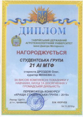За високі комплексні показники у навчанні, науці та досягнення у громадській діяльності ректор Таврійський державний агротехнологічний університет імені Дмитра Моторного д.т.н., професор Кюрчев В.М. нагородив студентську групу почесним дипломом Таврійського державного агротехнологічного університету і грошовою премією в розмірі 2000 гривень. Староста групи Дроздов Олег, куратор групи старший викладач кафедри МСТТ Мілаєва І.І. Такий конкурс проводиться в університеті щороку, він підвищує мотивацію студентів до навчання, залучає їх до наукової роботи та активізує їх творчі здібності.
