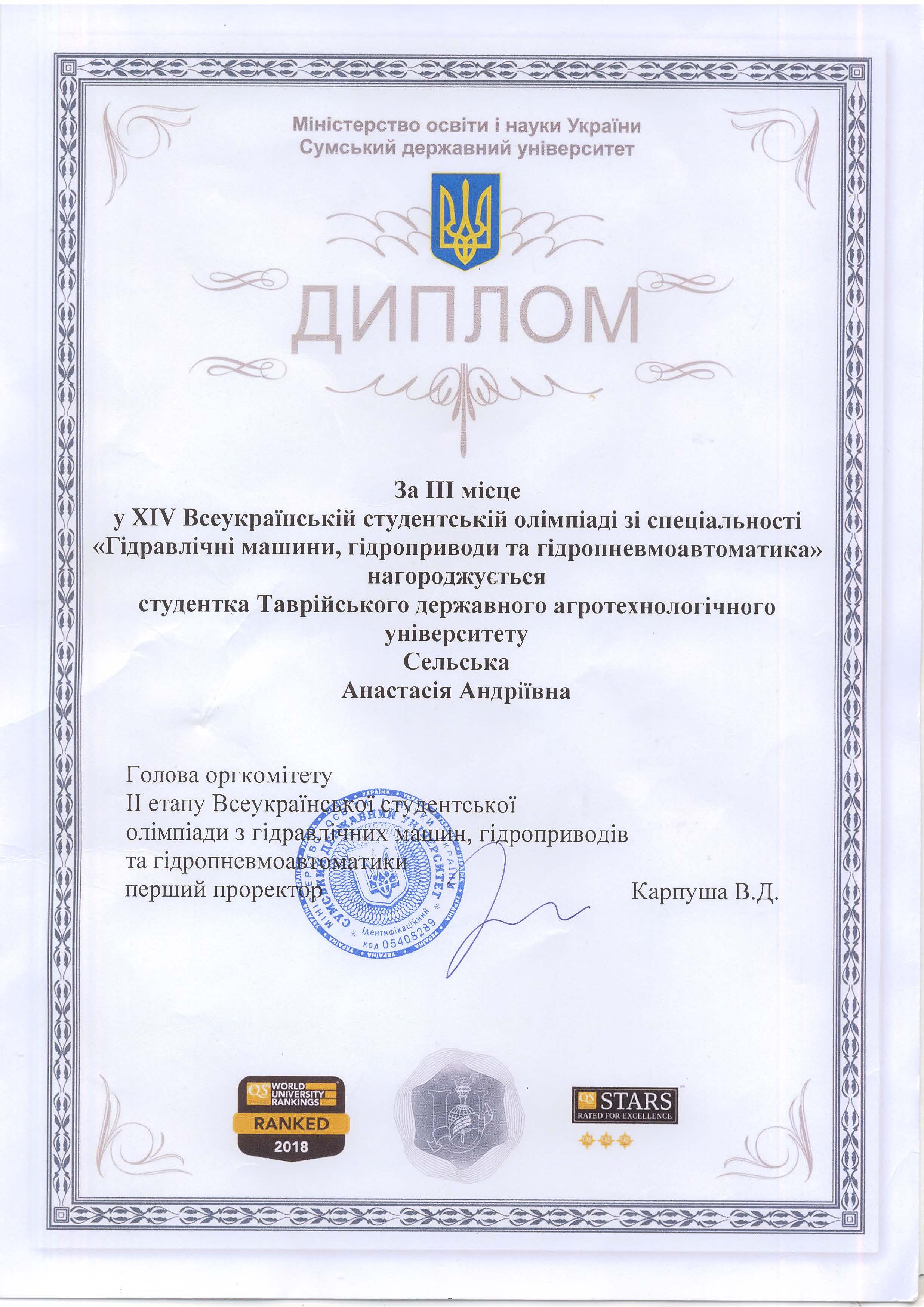 У Сумському державному університеті з 09 по 11 квітня 2019 року проходила XIV Всеукраїнська студентська олімпіада зі спеціальності “Гідравлічні машини, гідроприводи та гідропневмоавтоматика”. Таврійський державний агротехнологічний університет імені Дмитра Моторного представляла студентка IV курсу механіко-технологічного факультету Сельська Анастасія Андріївна. Вона успішно впоралася з усіма конкурсними завданнями олімпіади. За результатами олімпіади Сельська Анастасія Андріївна була нагороджена Дипломом за ІІІ місце. (науковий керівник – д.т.н., професор, кафедри “Мехатронні системи та транспортні технології” ТДАТУ Волошина А. А.)