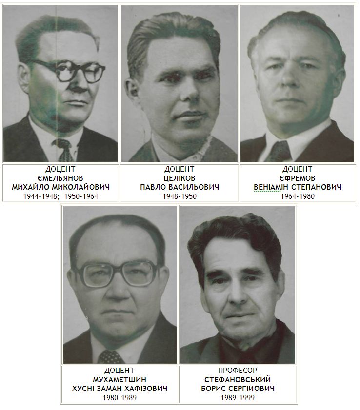 Протягом усього періоду існування кафедри її очолювали: Борзаковський Є. М. (до 1944 р.), Ємельянов М.М. (1944-1948 рр.; 1950-1964 рр.), Целіков П. В. (1948-1948 рр.), Єфремов В. С. (1964-1980 рр.), Мухаметшин Х.Х. (1980-1989 рр.), Стефановський Б. С. (1989-1999 рр.), Панченко А. І. (з 1999 року по теперішній час).