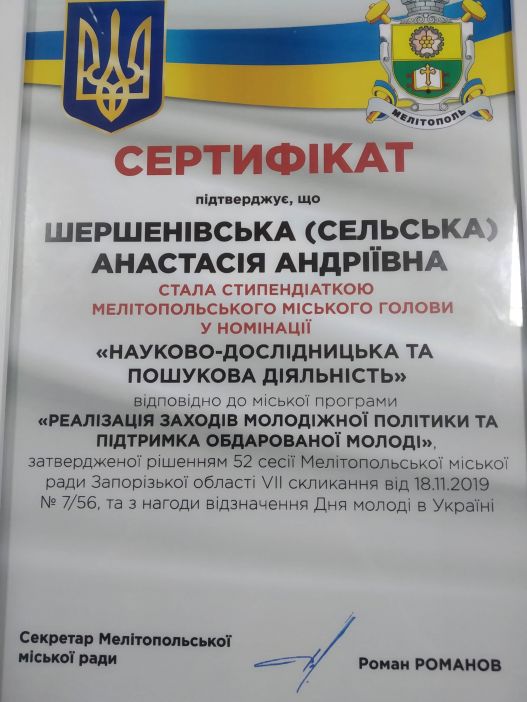За дорученням в.о. мера Мелітополя Іван Федоров вручив сертифікати стипендії міського голови кращим студентам. Серед нагороджених студентка механіко-технологічного факультету ТДАТУ 15 МБ АІ групи Анастасія Шершенівська.