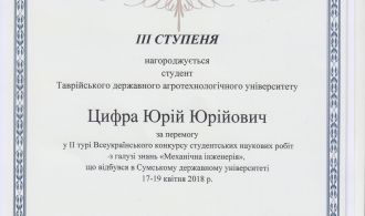 Вітаемо переможеця ІІ туру Всеукраїнського конкурсу студентських наукових робіт зі спеціальності “Механічна інженерія”, який відбувся 17-19 квітня в Сумському державному університеті – студент 13 МБ АІ групи механіко-технологічного факультету Таврійського державного агротехнологічного університету Цифра Юрій Юрійович нагороджений дипломом ІІІ ступеня за наукову роботу “Покращення вихідних характеристик гідравлічного обертача планетарного типу шляхом модернізації його розподільної системи” (науковий керівник – […]