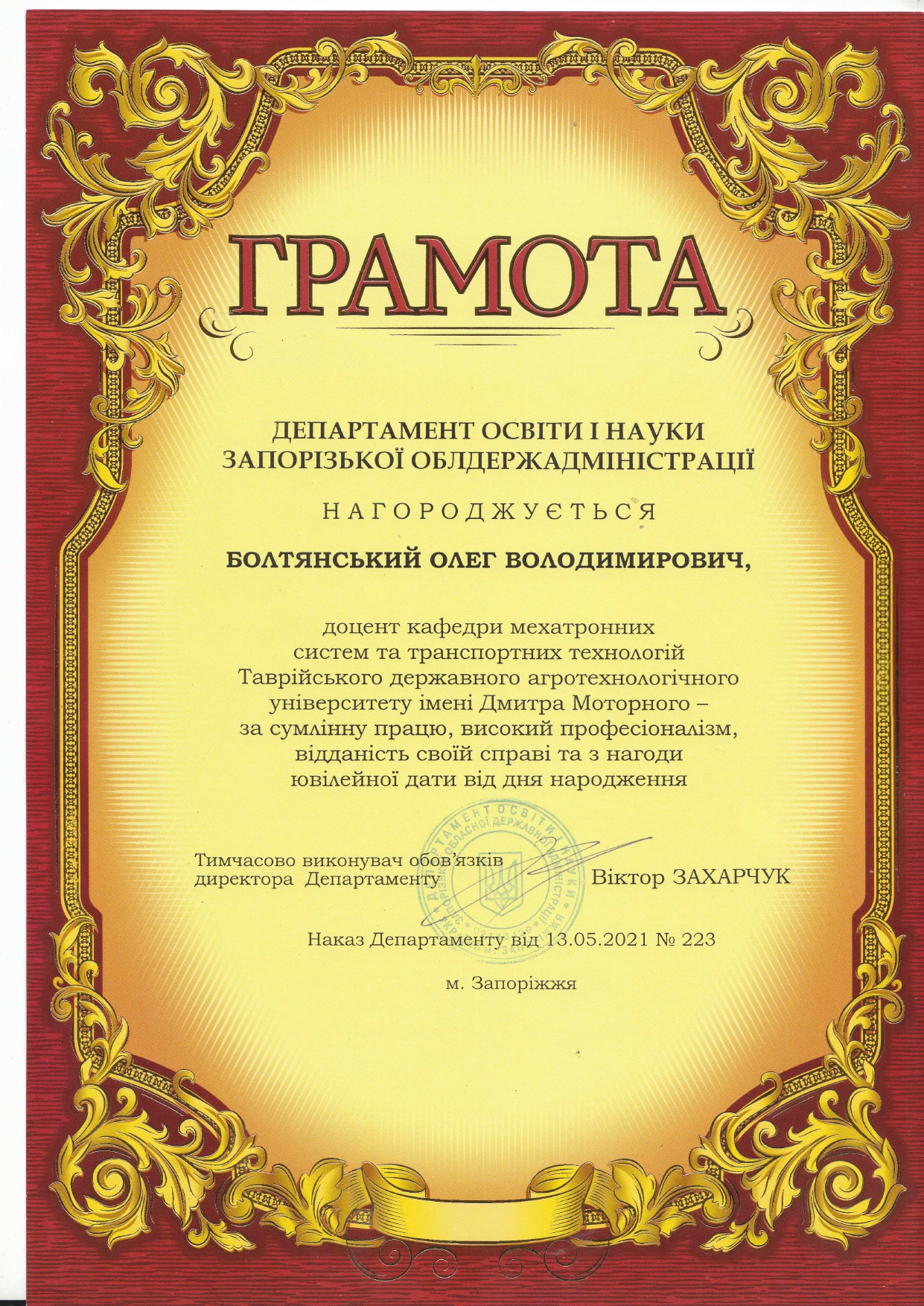 Щиро вітаємо доцента кафедри МСТТ Олега Болтянського з нагородженням почесною грамотою Департаменту освіти і науки Запорізької облдержадміністрації за багаторічну сумлінну працю, високий професіоналізм, відданість своїй справі.