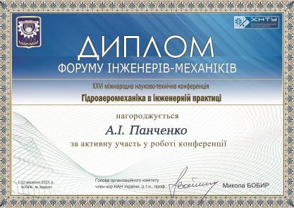7-10 вересня 2021 року у Херсонському національному технічному університеті в рамках ФОРУМУ ІНЖЕНЕРІВ МЕХАНІКІВ проходила XXVI Міжнародна науково-технічна конференція “ГІДРОАЕРОМЕХАНІКА В ІНЖЕНЕРНІЙ ПРАКТИЦІ”.