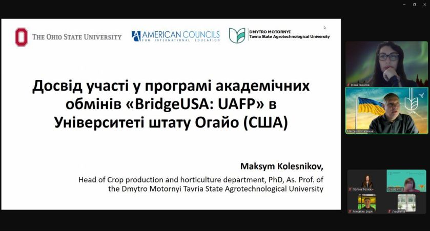 Всі присутні на зустрічі дізнались про деталі проходження програми та локації, які відвідав представник ТДАТУ. Проходження програми відбувалося в Коледжі харчових, сільськогосподарських та екологічних наук у двох кампусах (м. Колумбус та м. Вустер). Найбільш цінним досвідом виявилося живе спілкування з представниками академічної спільноти університету, в ході якого Максима Колеснікова було ознайомлено з особливостями освітніх програм, силабусів та методиками викладання курсів на спеціальностях «Агрономія», «Садівництво», «Ландшафтний дизайн», «Тваринництво», «Агробізнес» «Науки про навколишнє середовище».