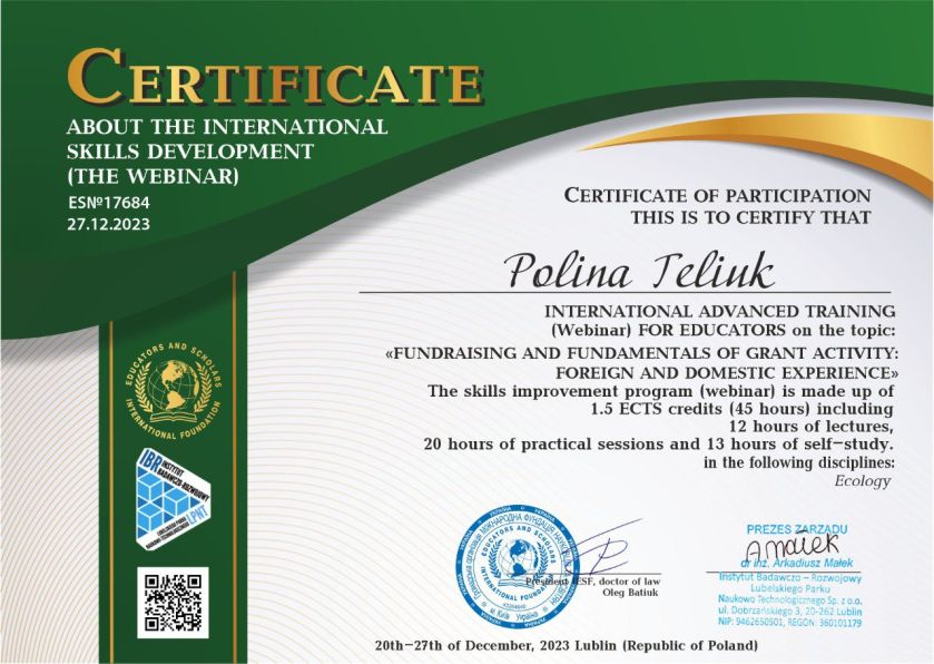МІЖНАРОДНЕ ПІДВИЩЕННЯ КВАЛІФІКАЦІЇ проходило у вигляді вебінару на тему: «ФАНДРАЙЗИНГ ТА ОСНОВИ ГРАНТОВОЇ ДІЯЛЬНОСТІ: зарубіжний та вітчизняний досвід»
