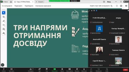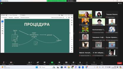 Кожен напрям міжнародної діяльності в презентації розкривав сутність, переваги, а також умови участі. Учасники зустрічі ознайомились із процедурами оформлення документів та виїзду за кордон. На зустріч Дар’я Легеза нагадала, що університет працює в рамках дії Закону України «Про мобілізаційну підготовку та мобілізації» і більше розкрила питання академічній мобільності чоловіків під час військових дій.