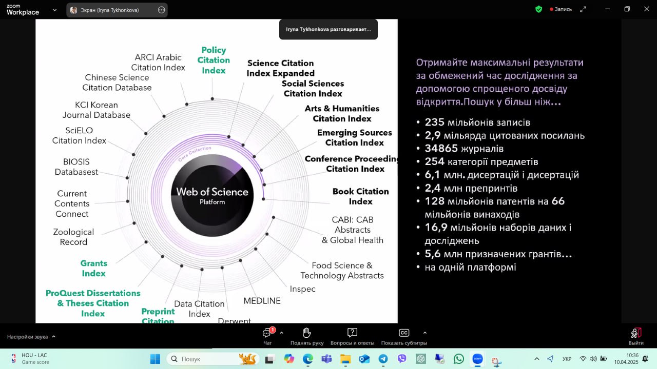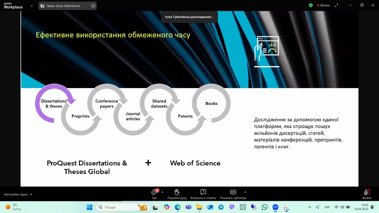 Окремим блоком було представлено огляд можливостей роботи з міжнародною базою Web of Science. Учасникам показали, як здійснювати пошук релевантної наукової літератури, як перевіряти індекс цитування, а також як уникати публікацій в сумнівних виданнях, які не відповідають критеріям якості.