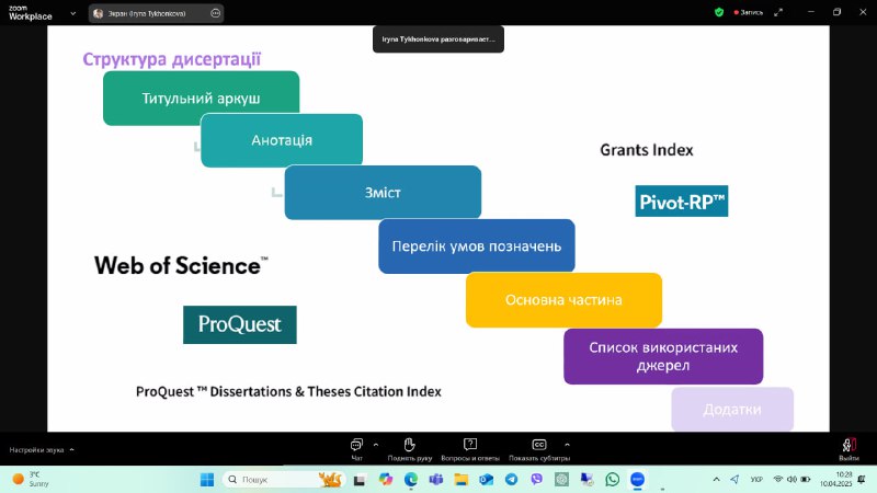 Учасники отримали практичні поради щодо структурування наукового тексту, оформлення посилань, вибору наукових журналів для публікацій, а також дізналися про ключові інструменти, які допомагають оптимізувати процес написання дисертації.