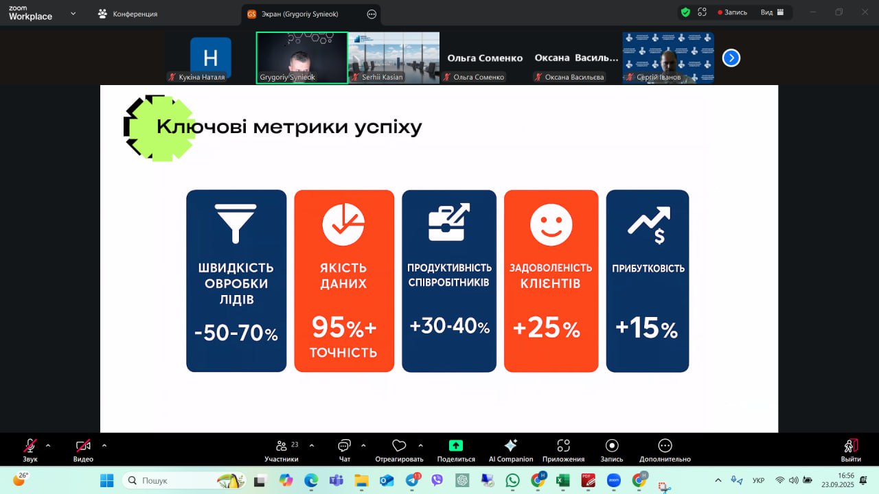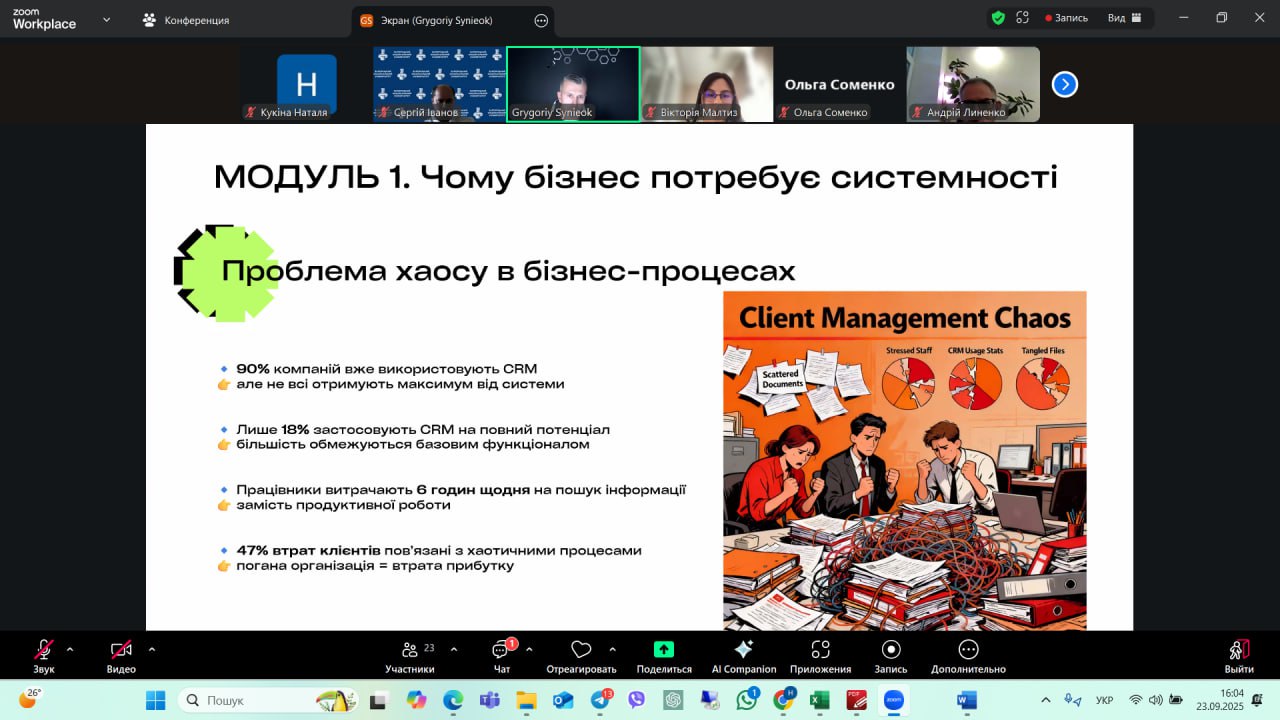 23 вересня 2025 року аспіранти та магістри кафедри маркетингу ТДАТУ взяли участь у тренінгу «Від хаосу до системи». Подію провів Григорій Синеок, CEO компанії Syntech, який поділився практичними інструментами з оптимізації бізнес-процесів перед впровадженням CRM-системи.