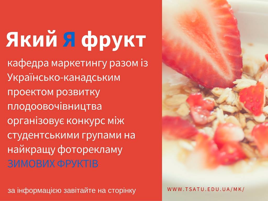 Кафедра маркетингу спільно з Українським проектом розвитку плодоовочівництва за фінансової підтримки Міністерства закордонних справ, торгівлі і розвитку Канади оголошує конкурс фотографій студентської групи «ЯКИЙ Я ФРУКТ».