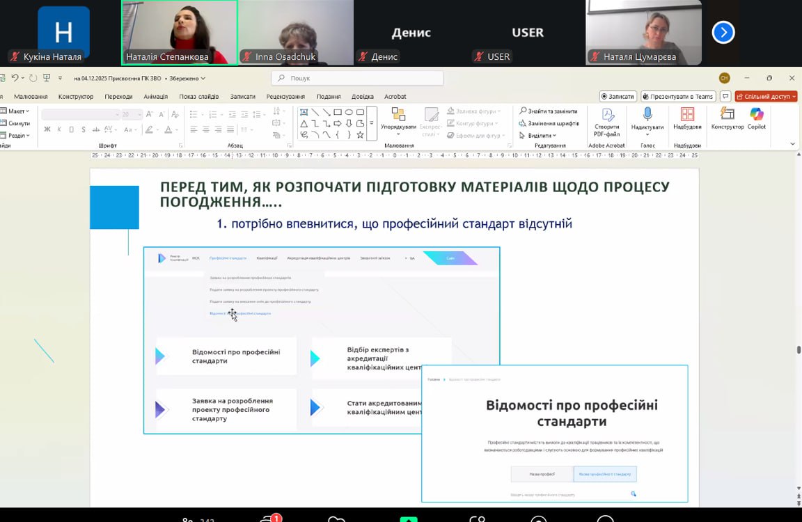Під час вебінару було розглянуто актуальні питання практичного застосування нормативних положень щодо присвоєння професійних кваліфікацій у ситуаціях, коли відповідні професійні стандарти ще не затверджені. Особливу увагу приділено типових помилок, яких припускаються заклади вищої освіти під час реалізації цих процедур, а також шляхам їх усунення з урахуванням чинного законодавства та рекомендацій Національного агентства кваліфікацій.